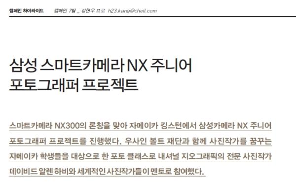 덧붙여서 사진은 자기 자신을 표현할 수 있는 도구이며 스포츠 경기처럼 기록을 뛰어넘는 사람이 잘하는 것이 아니라 무용이나 음악처럼 순위가 없는것이라고, 여러분 모두가 좋은 포토그래퍼가 될 수 있다고 이야기했다. 정말 이 프로젝트에 참여해 데이비드의 이야기를 열심히 듣던 25명의 자메이카 학생 중에서 훗날 그와 같은 세계적인 사진작가가 나올지도 모르겠다. 그렇다면 그 처음 시작을 NX 주니어 포토그래퍼 프로젝트가 함께한것이고, 이 캠페인은 NX300 홍보를 위한 캠페인으로 시작했지만 누구에게는 인생을 바꾸는 계기를 마련해 준 것이리라.
