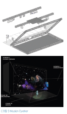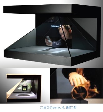 공연, 전시쪽에 주로 사용하는 홀로그래피 기술 구현 방법은 <그림 1>과 같이 영상을 45도 기울인 투명 포일에 반사하는 방식과 수증기나 안개 등 물에 투사하는 방식 두 가지로 크게 구분된다. 전자는 사용자가 포일을 통과할 수 없으므로 포일 앞과 뒷면에 스테이지를 만들어 현실과 가상이 완벽한 조화를 이루는 무안경 입체영상을 연출한다. 후자는 빔프로젝터를 활용하여 폭포와 같은 물 표면과 수증기, 안개를 대형스크린처럼 활용하기 때문에 사용자가 통과할 수 있는 스토리텔링을 연출할 수 있다. 앞서 소개한 두 가지 방식의 단점은 모두 주로 빔프로젝터를 이용하기 때문에 실내에서는 몰입감 있는 공간 연출을 위해 주변 환경을 어둡게 세팅해야만 하며, 실외에서는 밤에만 사용할 수 있다는 점이다.