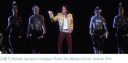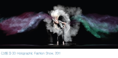 국내에서는 주로 SM 및 YG 엔터테인먼트의 스타를 중심으로 연출한 콘서트공연에서 홀로그래피가 사용되고 있다. 다국적으로 많은 팬이 실제 스타를 만나기 어렵다면 TV보다 더욱 현실감과 실재감을 극대화한 연출로 표현되는 스타를 만날 수 있기 때문이다. 해외의 경우에는 <그림 2>와 같이 이미 고인이 된 마이클잭슨 사례처럼 보고 싶지만 볼 수 없는, 현실에서는 존재하지 않는 스타를 재현하여 시간과 공간을 넘나드는 생동감 있는 연출을 하고 있다. 또한 <그림 3>과 같이 트렌디한 분야인 패션상품을 아름답게 보여주는 연출기법으로도 사용하고 있다. 이처럼 브랜드의 긍정적인 이미지 형성과 결속력을 강화하고 잠재고객을 효과적으로 유입하는 매체로서 광고/마케팅의 한 분야로 홀로그래피를 활용하고 있다.