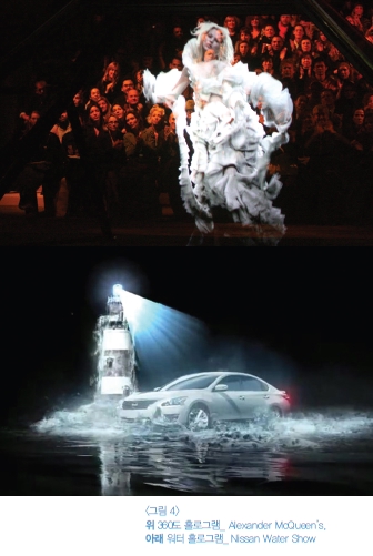 첫째, 홀로그래피 연출 시 가장 중요한 Hyper realism은 가상이 아닌 현실처럼 현장감과 실재감을 높이는 것이다. 때문에 실재 연기자(Real Performer) 또는 실재 제품(Real Product)과 미리 촬영한 가상 연기자(Virtual Performer) 또는 3D로 제작한 Virtual Object의 호흡을 정확히 맞추어야 한다. 그리고 <그림 4>의 Kate Moss가 실제 사람처럼, Nissan의 자동차가 물 위를 진짜 드라이빙하는 것처럼 영상에서 보이는 크기와 이팩트도 실제와 같이 맞추어야 한다.