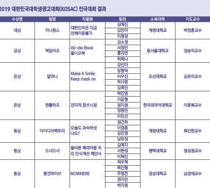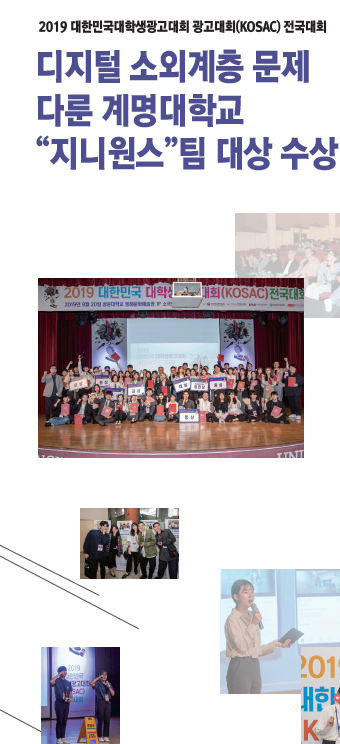 한국광고총연합회가 주관하고 문화체육관광부가 주최한 ‘2019 대한민국대학생광고대회(Korea Student Advertising Competition, 이하 KOSAC) 전국대회가 지난 9월 20일(금) 광운대학교 동해문화예술관에서 열려 현업광고인들을 비롯해 전국의 대학교 학생들과 교수 등 약 200여명이 참석한 가운데 약 7개월간의 긴 여정을 성황리에 마무리했다.